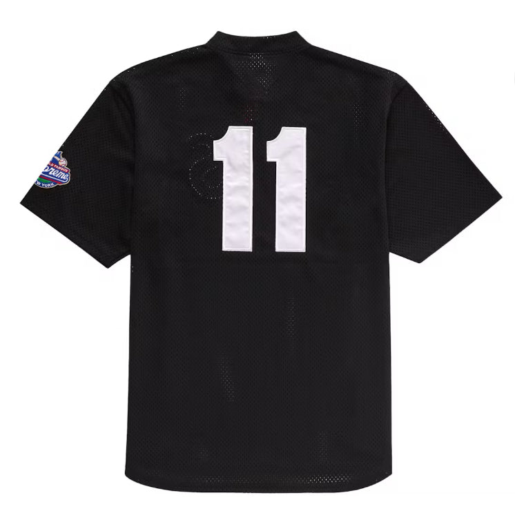Poly eyelet mesh henley. Satin twill appliqué at chest and back. Embroidered patch on sleeve and athletic label at lower front.